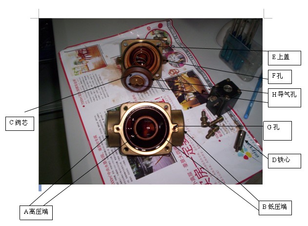 1 断油阀未得电时,  D依靠弹簧的弹力将上盖的上下腔体连接孔关闭,致使 低压端无法通过F.G孔和上盖的下腔体连通。此时高压通过H导气孔到达上盖的下腔体,使得高压端和上盖的下腔体连通而压力相通,C阀芯不动作。断油阀A,B端不通。